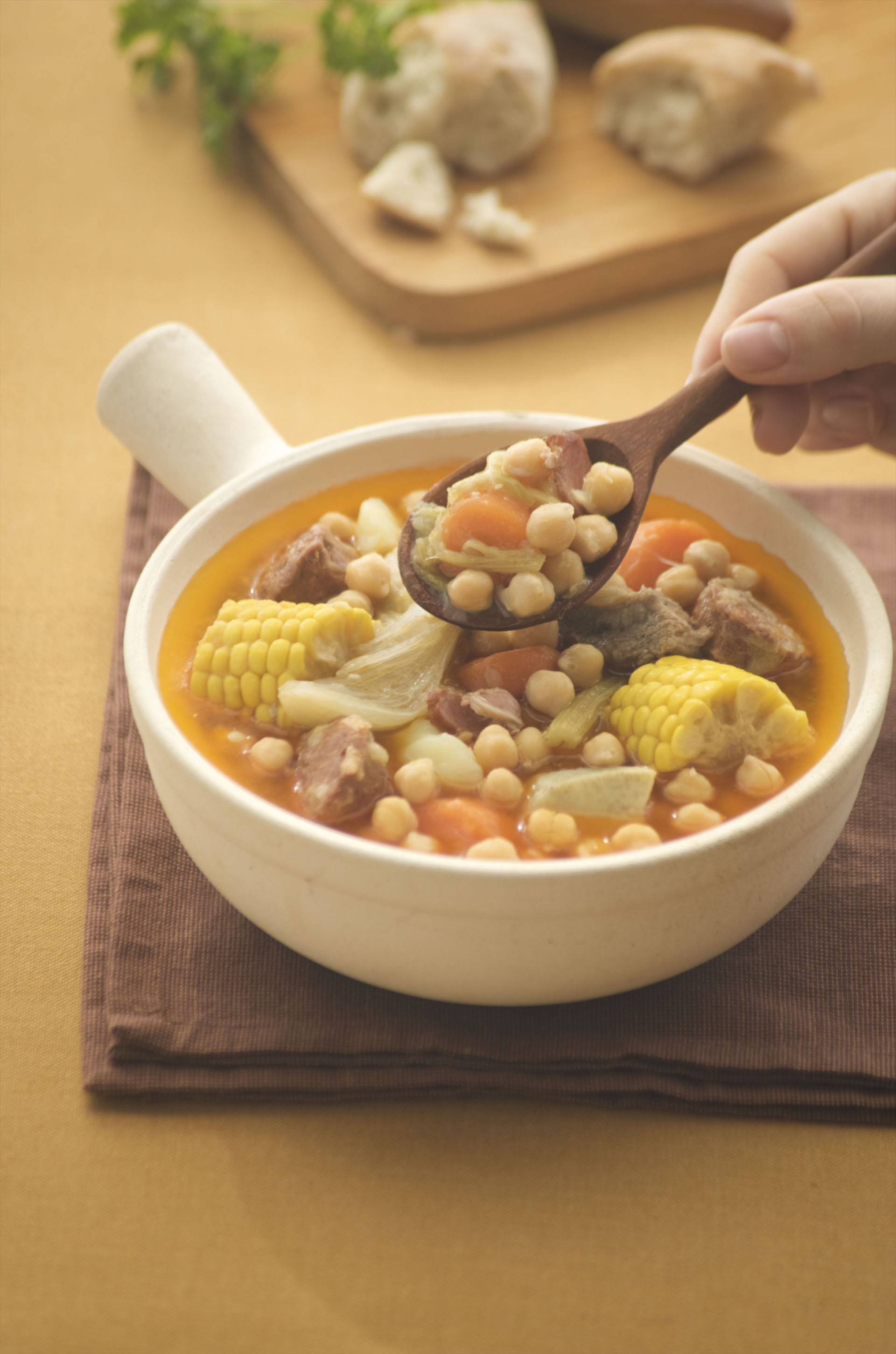 En la otra cacerola introducir los vegetales en este orden: zanahorias, papas, calabaza, batatas, cebollas, puerros, apio y choclos. Cocinar hasta que todos estén tiernos. Retirarlos y pasarlos por agua fría. Escurrir bien y saltear los vegetales en una sartén con la mitad del aceite, salpimentando a gusto. Retirar y disponerlas en una fuente junto con la carne, las legumbres, panceta y el repollo en forma alternada. Rociar con el Aceite Puro de Girasol Natura restante y servir.