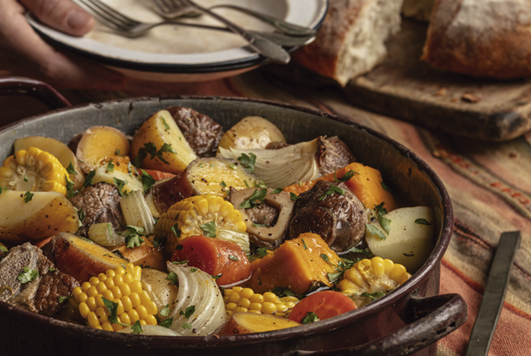 Lavar y pelar las zanahorias, papas y batatas. Pelar los choclos y cortarlos en ruedas. Cortar el apio y los puerros en bastones de aproximadamente 4 cm. Lavar y cortar en cubos el zapallo. Cortar la cebolla pelada en cuartos. Reservar.