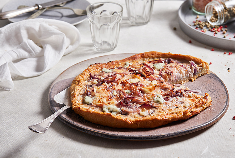 En un bowl mezclar la crema con los huevos, incorporar las cebollas y el queso azul desmenuzado. Reservar.