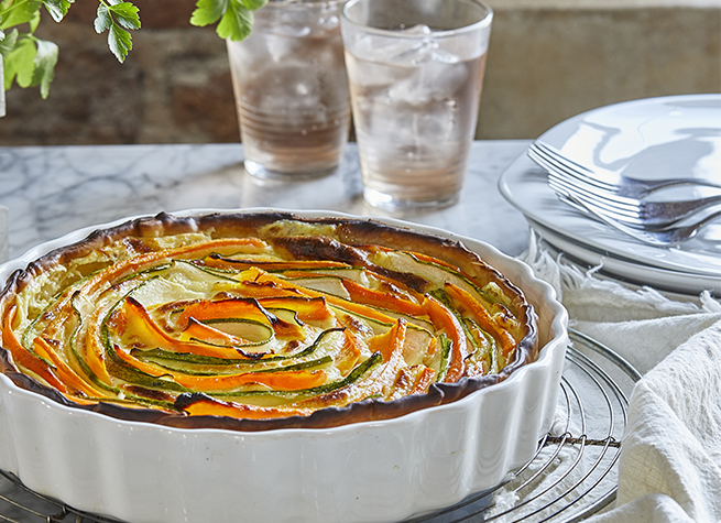 Disponer el disco de masa sobre una tartera lubricada con Rocío Vegetal Natura. Cubrir el fondo con la salsa reservada. Disponer por encima los vegetales alternados y de forma vertical formando un espiral desde los bordes hacia el centro.
