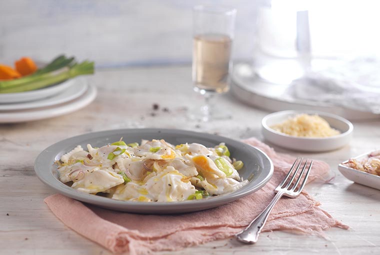 Para la salsa, saltear los echalotes y los blancos de puerro junto con el Aceite de Oliva Intenso Natura. Una vez que estén algo tiernos, añadir el vino blanco, dejar que el alcohol se evapore y añadir la crema de leche.