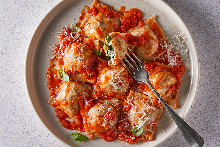 Calentar abundante agua con sal en una cacerola. Una vez que el agua esté hirviendo colocar los ravioles y cocinar aproximadamente 5 minutos y retirarlos cuidadosamente con una espumadera.