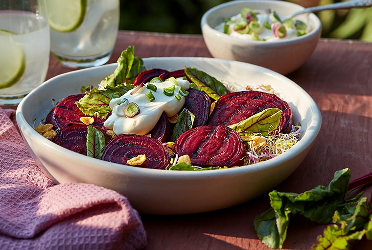 Cortar las remolachas en rodajas de 2 cm. de espesor y asar en parrilla, a fuego directo, o sobre una plancha durante 5 minutos de cada lado.