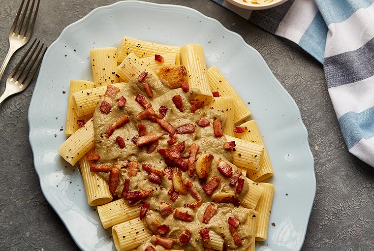 Rigatoni con crema de alcaucil y panceta