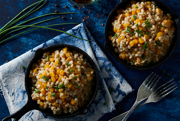Mientras tanto calentar otra sartén a fuego fuerte, incorporar la cebada perlada y tostarla por algunos minutos mezclando para que no se queme. Agregar el vino blanco y revolver inmediatamente. Incorporar la cebada a la sartén del zapallo y mezclar. Continuar la cocción del risotto de cebada añadiendo caldo caliente de a poco y revolviendo permanentemente con cuchara de madera durante unos 16-18 minutos.