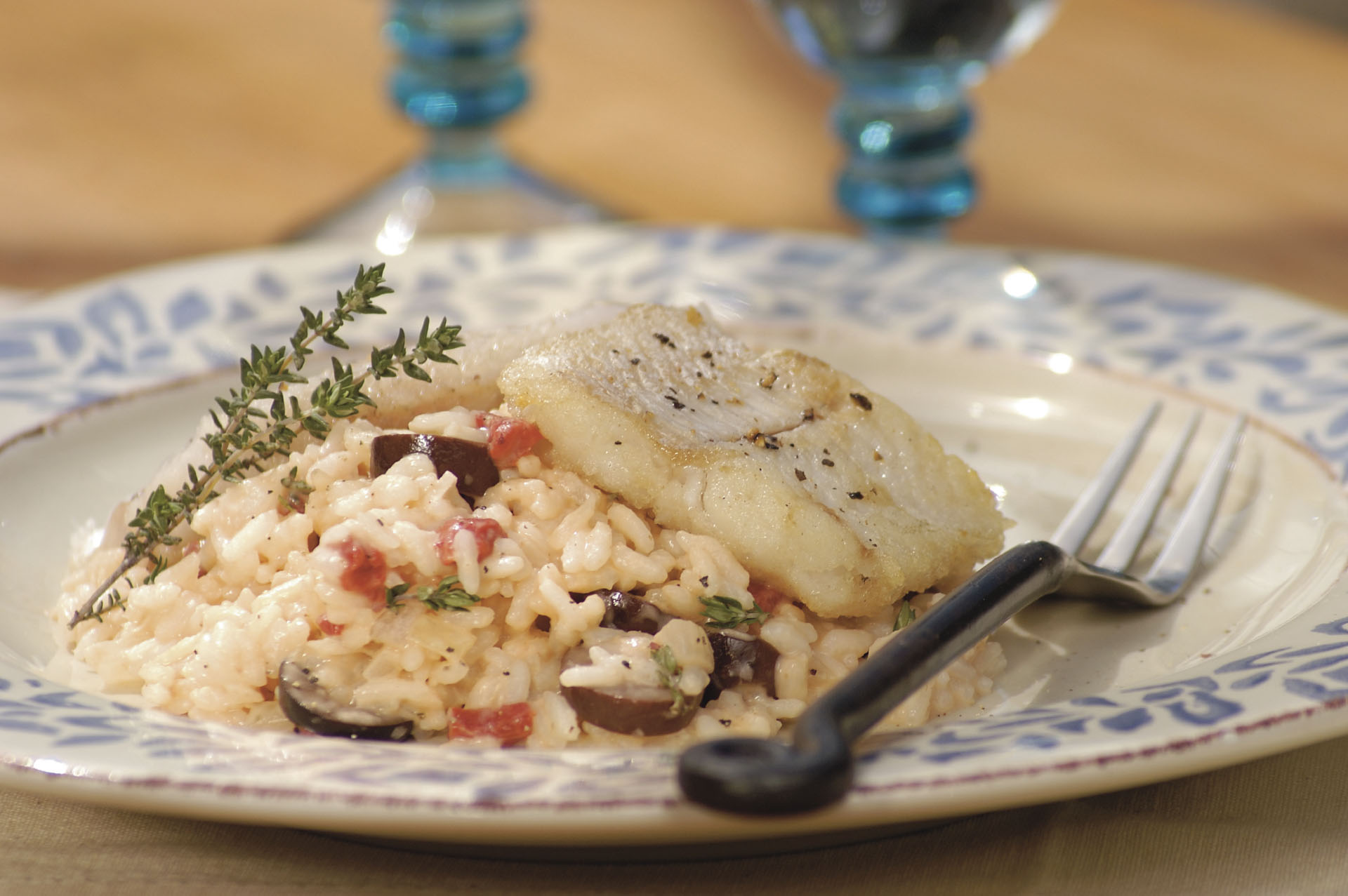 Cortar los filetes de pescado en trozos grandes, salpimentar y dorarlos en Aceite Oliva Virgen Extra Natura de ambos lados. Aparte, colocar el Aceite Oliva Virgen Extra Natura en una sartén, llevar a fuego y rehogar allí la cebolla. Incorporar entonces el arroz cocido y escurrido, los morrones cortados en tiras, las aceitunas y el tomillo.