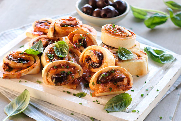 Luego, espolvorear la mesada con fécula y estirar con la ayuda de un palo de amasar en forma rectangular. Rellenar con una capa de puré de tomates, la albahaca picada y ajustar con sal. Agregar las aceitunas picadas y el queso rallado. Enrollar partiendo de uno de los lados más cortos y cortar cuidadosamente en modo transversal.