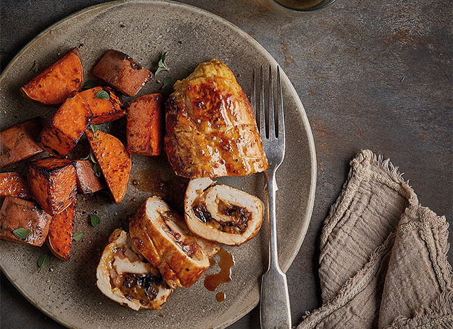 Pincelar cada feta con Mostaza Natura, distribuir una cucharada generosa de relleno y enrollar dando forma de roll. Bridar cada uno para que conserve su forma al cocinarlo. Reservar.