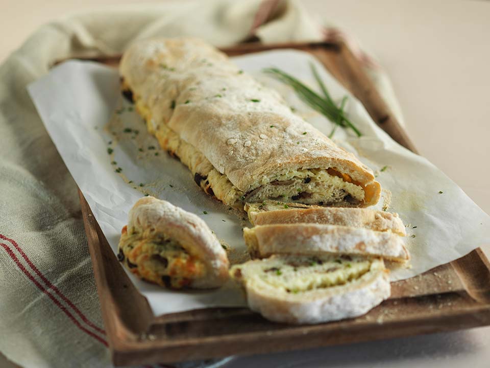 Espolvorear la mesada con harina y con la ayuda de un palote extender la masa en una capa fina dándole forma rectangular. Disponer sobre ella el relleno dejando los bordes libres, enrollar y cerrar los lados con un repulgue. Dejar leudar unos 10 minutos más sobre una placa para horno lubricada con abundante Rocío Vegetal Natura.