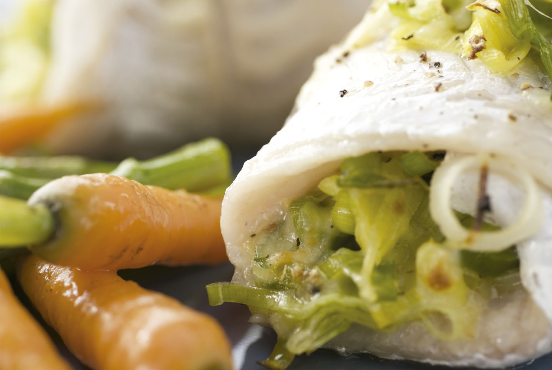 Rollitos de merluza con cebollas, zapallitos y batatas horneadas