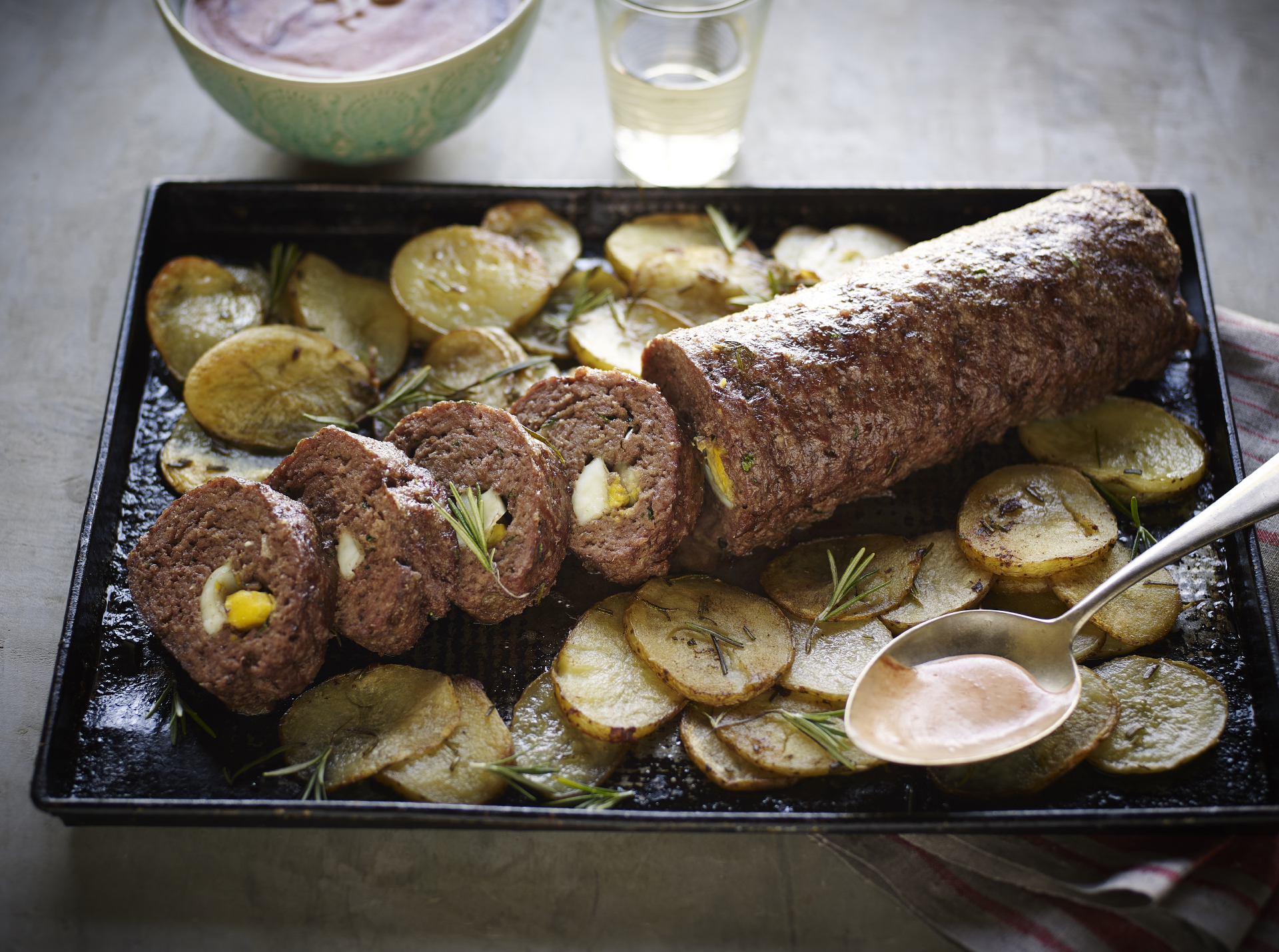 Rollo de carne con ketchup y papas rústicas