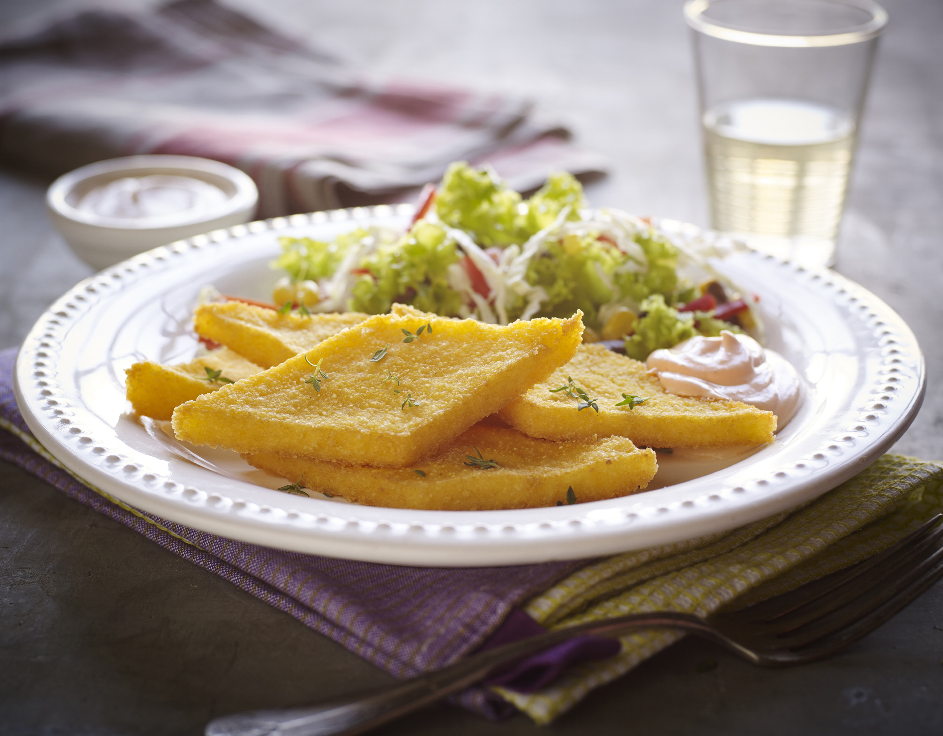 Rombos crocantes de maíz con ensalada multicolor