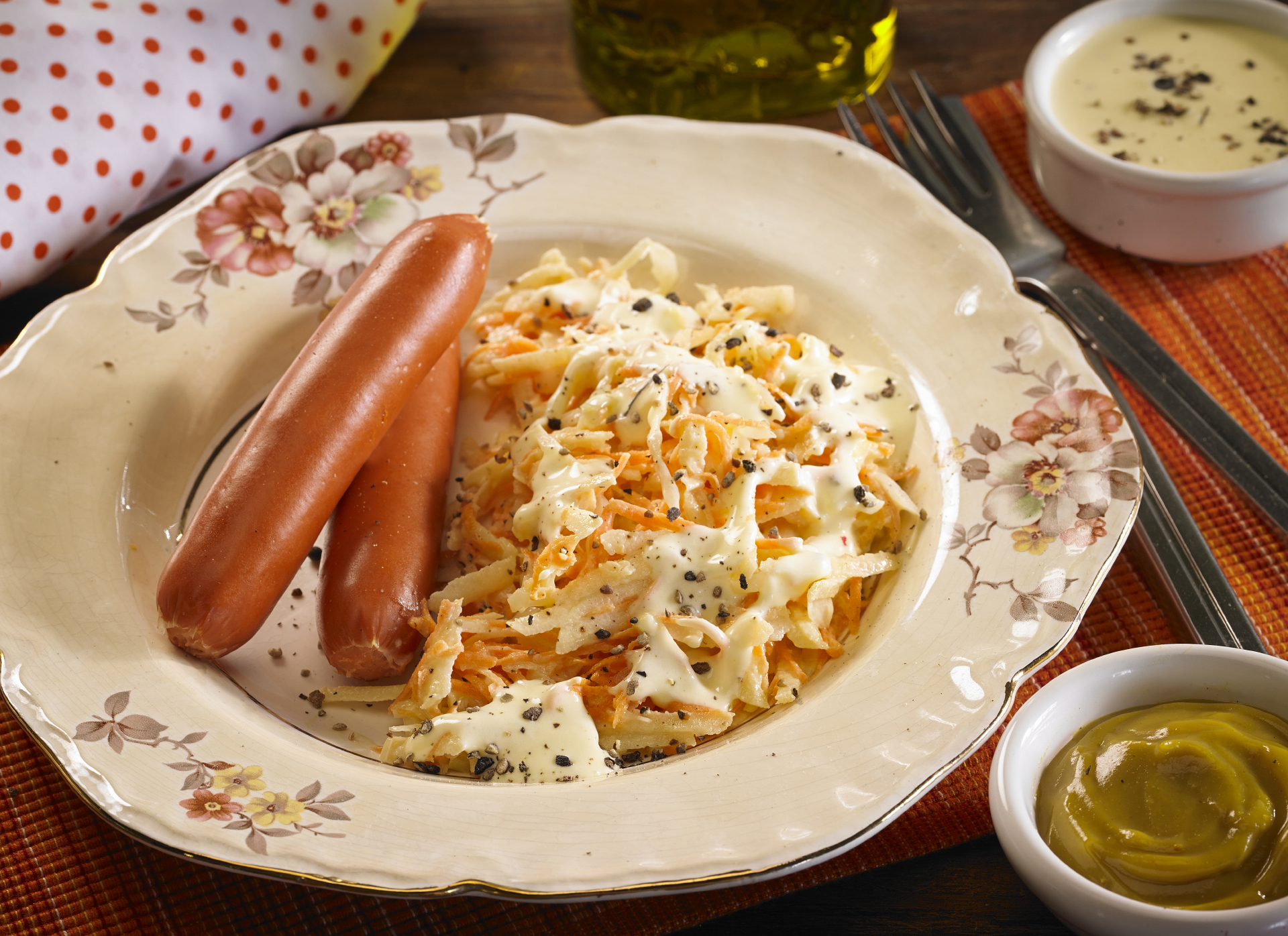 Hervir las salchichas en abundante agua. Una vez cocidas retirarlas y servirlas acompañadas con Mostaza Natura y la ensalada de repollo.