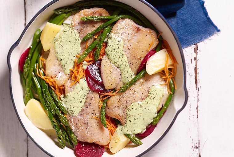 Salmón blanco a la plancha acompañado de vegetales al vapor y aderezo de mayonesa al eneldo