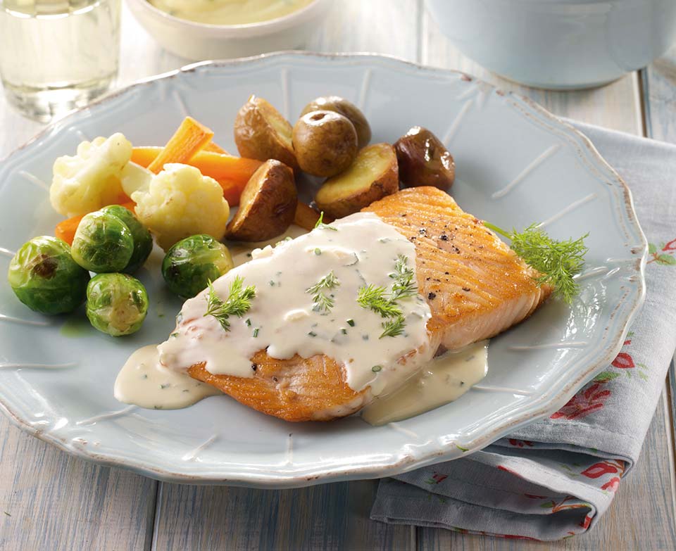 Disponer en una fuente las rodajas de salmón con su salsa y alrededor intercalar los bastones de zanahoria, los papines, los repollitos y las flores de coliflor. Aderezar con una salsa preparada con la Mayonesa Natura y Mostaza Natura (si se desea, añadir un chorrito de Aceite de Girasol Natura para aligerar la salsa) mezcladas con un toque de ciboulette.