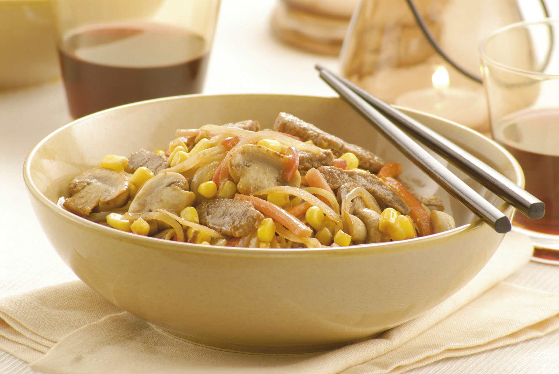 Poner a fuego vivo una sartén bastante grande y volcar en ella el Aceite Puro de Girasol Natura. Dorar allí la cebolla, ají, zanahorias y champiñones y luego de unos minutos incorporar la carne y condimentos. Remover enérgicamente con una cuchara de madera de mango largo hasta que las verduras estén cocidas pero crujientes y la carne a punto.