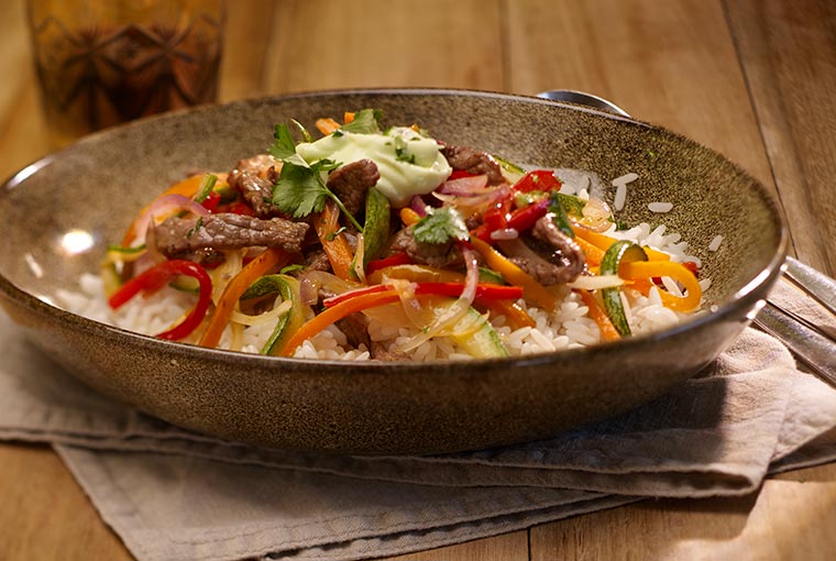 Servir el salteado de carne y vegetales sobre el colchón de arroz decorado con un toque de Mayonesa Natura y perejil picado.
