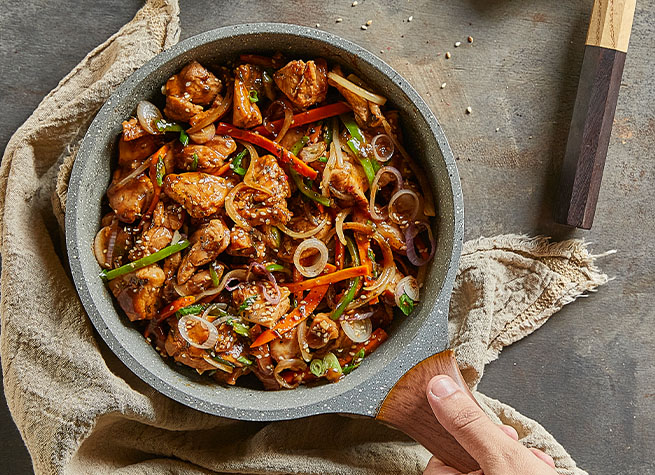 Calentar una sartén con un hilo de Aceite Blend Natura, sellar los cubos de pollo macerados, retirar y reservar. Agregar a la sartén el aceite restante y rehogar los vegetales. Cuando la cebolla transparente, incorporar el pollo sellado y completar la cocción. Ajustar con una pizca de sal de ser necesario.