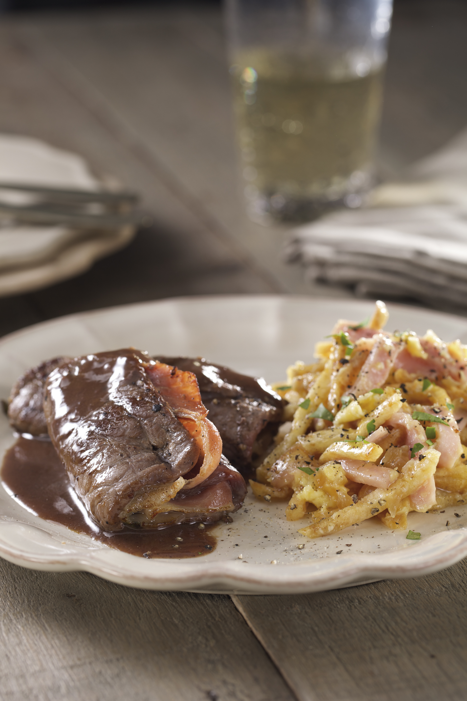 Retirar y servir los saltimbocca, y acompañar con el revuelto gramajo: