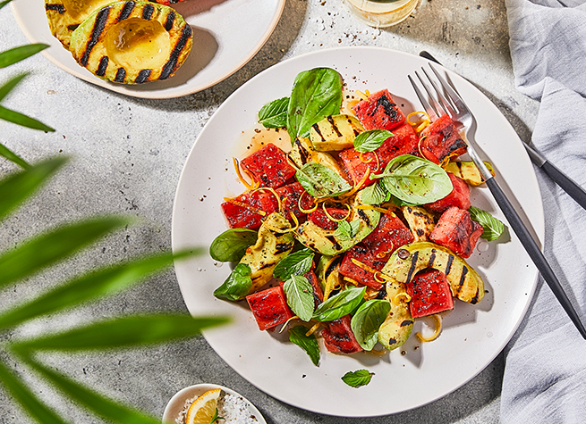 Pincelar nuevamente la grilla con otro poco de Aceite de Oliva Selección Natura y grillar las fetas de sandía durante unos 3-4 minutos por lado, habiendo descartado antes las semillas y la cáscara. Retirar, cortar en cubos y unir a la palta reservada.