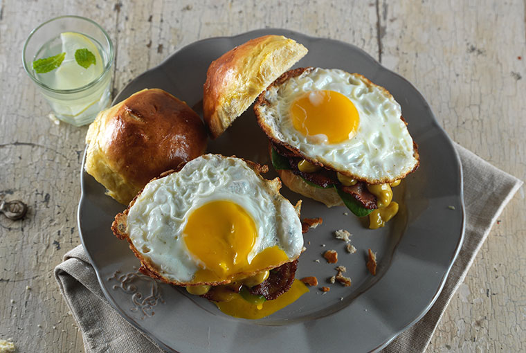 Para el armado de los sándwiches, cortar los panes para separarlos en dos tapas. Untarlas con Mostaza Natura, colocar unas hojas de espinaca, una feta de panceta y un huevo. Tapar con la otra tapa y servir.