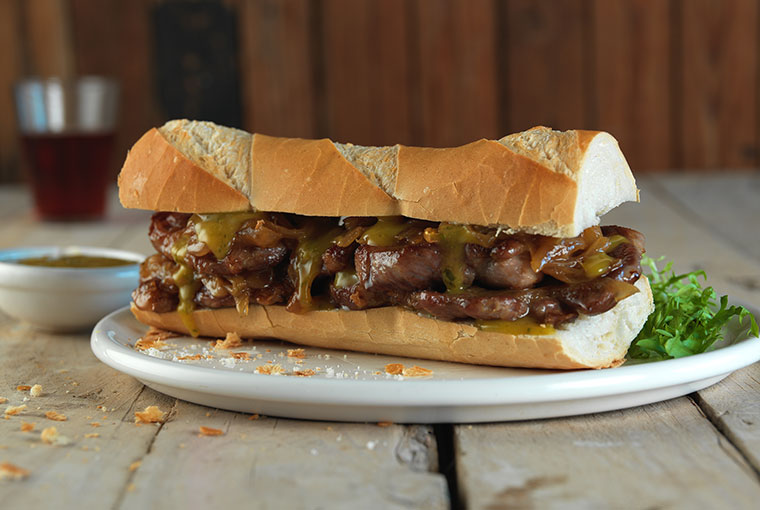 Abrir los panes, pincelar ambas tapas con la salsa de mostaza y miel, colocar unas cucharadas de las cebollas caramelizadas y disponer encima un bife de bondiola. Cerrar con la otra tapa del pan y servir.