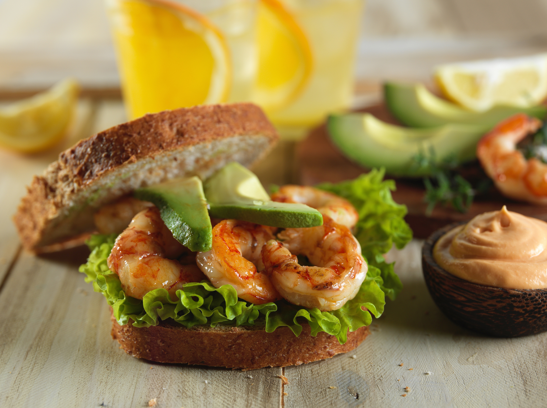 Sandwich de langostinos, palta, salsa golf y hojas verdes