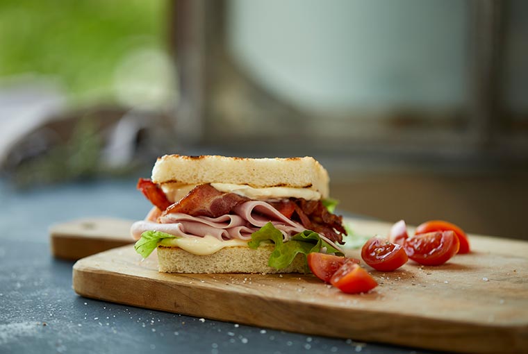 Para el armado del sándwich, untar con un poco de Mayonesa Natura una feta de pan dorado, apoyar una capa de lechuga en juliana, dos fetas de pavita, una capa de tomatitos en rodajas y dos fetas de panceta ahumada dorada. Agregar otra rebanada de pan y repetir las capas de relleno terminando el sándwich con una rebanada de pan. Cortar el sándwich en diagonal manteniéndolo firme con un palillo. Proceder del mismo modo con el segundo sándwich y servir.
