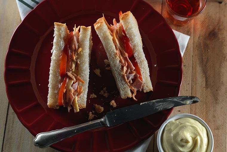 Para el armado de los sándwiches, colocar un poco del relleno en 4 de las rebanadas, disponer unas rodajas de tomate encima y tapar el sándwich con otra rebanada de pan.