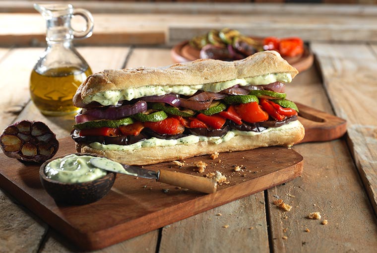 Para el armado de los sándwiches, cortar las ciabattas por la mitad. Untar una de las caras con la preparación de mayonesa y perejil. Colocar una o dos tiras de ají morrón, unas rodajas de berenjenas, unas fetas de zucchinis y unos aros de cebollas. Tapar con la otra cara del pan. Servir tibio.