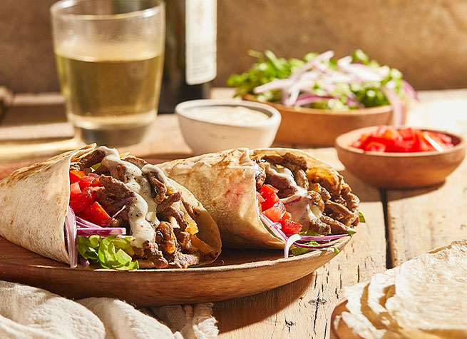 Rellenar cada tortilla con una porción de carne, una de vegetales cortados (tomate, cebolla morada y lechuga) y condimentar con la salsa al yogurt reservada. Cerrar la tortilla en forma de cono y servir.