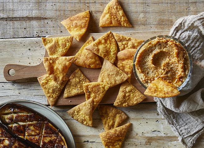 Para el humus, lavar y despuntar la berenjena, cortarla a la mitad por lo largo, salpimentar, distribuir por encima el ajo en láminas o picado groseramente y cocinar en horno precalentado sobre una placa lubricada con Rocío Vegetal Oliva Natura hasta que al pincharla esté blanda. Retirar y procesar junto con los garbanzos cocidos, el jugo de limón, un hilo de Aceite de Oliva Clásico Natura para obtener una mezcla homogénea y cremosa. Disponer en un cuenco, rociar con un hilo de Aceite de Oliva Clásico Natura, espolvorear con una pizca de paprika y las semillas de sésamo negro. Servir el hummus acompañado de los snacks.