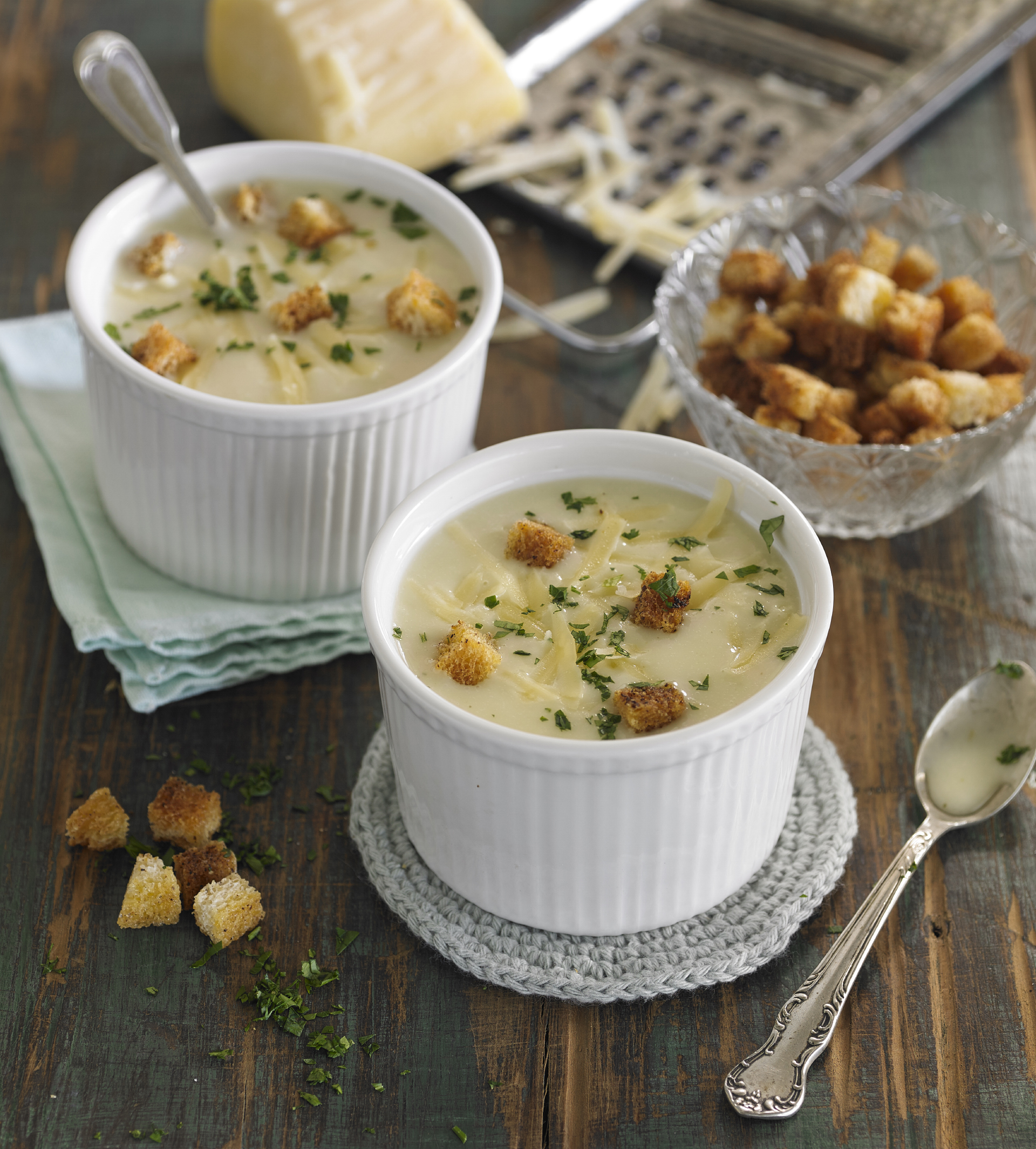 Servir bien caliente en platos hondos, espolvoreando con un poco de perejil picado y queso parmesano rallado. Decorar con los crutones.