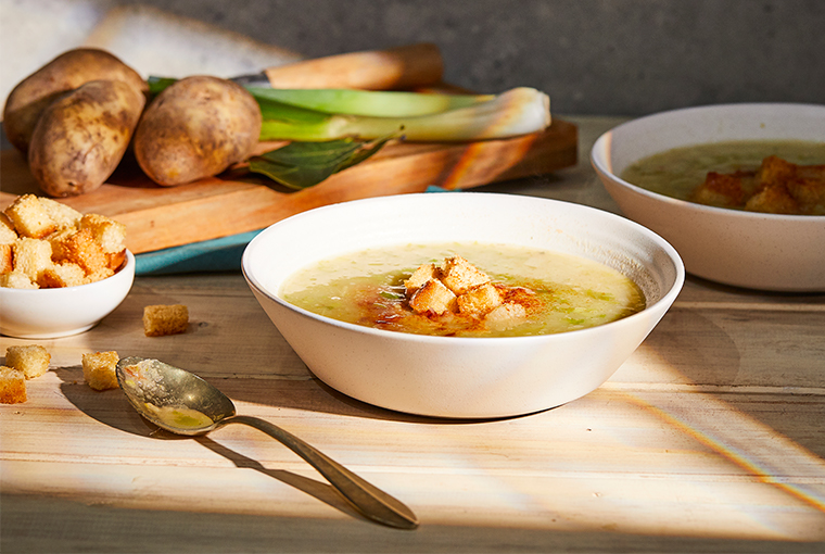 En una sartén calentar el Aceite de Oliva Clásico Natura, rehogar los puerros y el ajo hasta que estén tiernos. Incorporar las papas y mezclar. Añadir el cubo de caldo previamente diluido en media taza de agua caliente y luego agregar el resto. Perfumar con las hojas de laurel y cocinar a fuego bajo por 40 minutos, pisar las papas hasta lograr una textura cremosa.