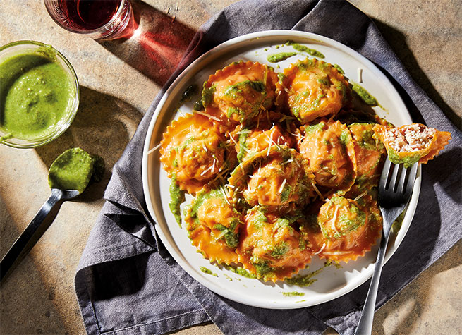 Una vez que los sorrentinos suban a la superficie dejarlos dos minutos y retirar con espumadera. Servirlos con el pesto.