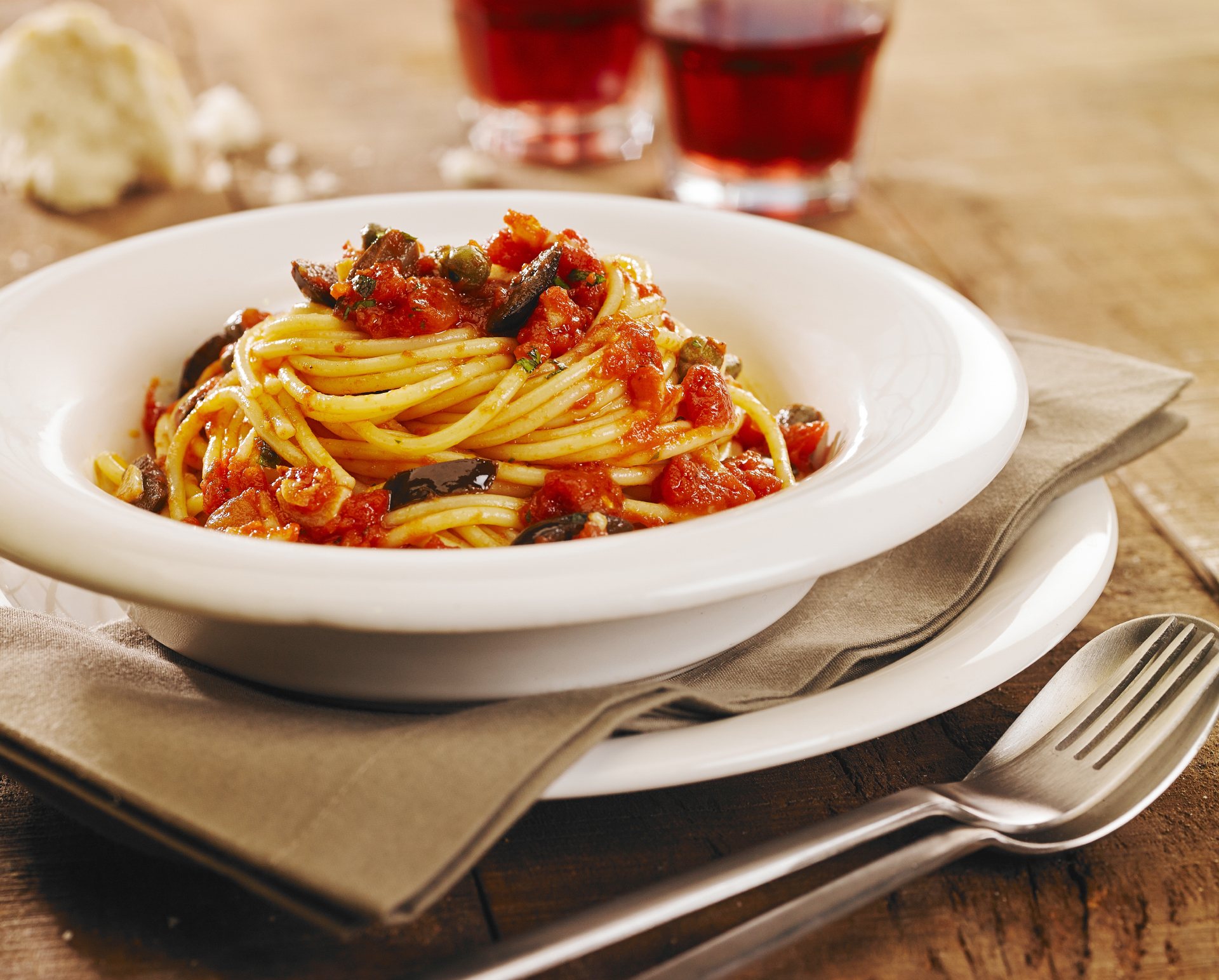 En una sartén mediana calentar el Aceite de Oliva Intenso Natura y rehogar los ajos. Apenas comiencen a dorarse incorporar el puré de tomates y continuar cocinando hasta que el aceite suba a la superficie. Agregar las aceitunas descarozadas, las alcaparras y condimentar con una pizca de sal y pimienta. Rehogar por 5 minutos más. Retirar del fuego y reservar.