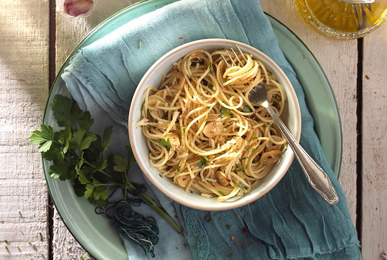 Cocinar los spaghetti en abundante agua caliente. Mientras tanto, preparar el condimento, pelar y cortar a la mitad los ajos, retirar el centro y cortarlos en fetas muy finas. Opcional, lavar y picar el ají picante sin el cabito. En una sartén, calentar a fuego suave el Aceite de Oliva Selección Natura y rehogar el ajo y el ají peperoncino (opcional) sin que se queme durante unos minutos.