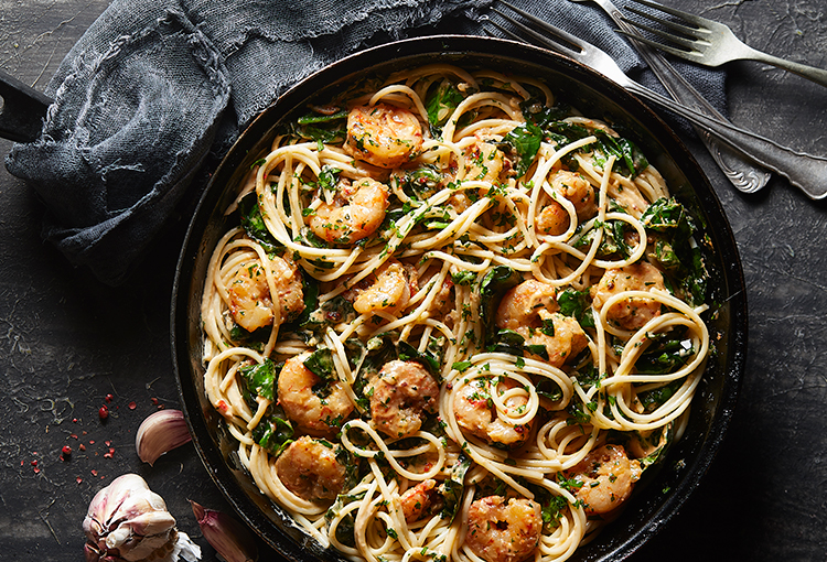 Una vez que los camarones cambian de color, incorporar las hojas de espinaca, mezclar y agregar los spaghettis reservados. Incorporar el queso rallado, el perejil picado y por último, agregar el jugo de limón y la Salsa Golf Natura, integrar y servir los sapaghettis bien calientes.
