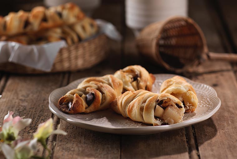 Cerrar la masa dando forma al strudel y llevar al horno caliente sobre una placa lubricada con Rocío Vegetal Natura durante unos 30 minutos aproximadamente hasta cocinar y dorar bien.