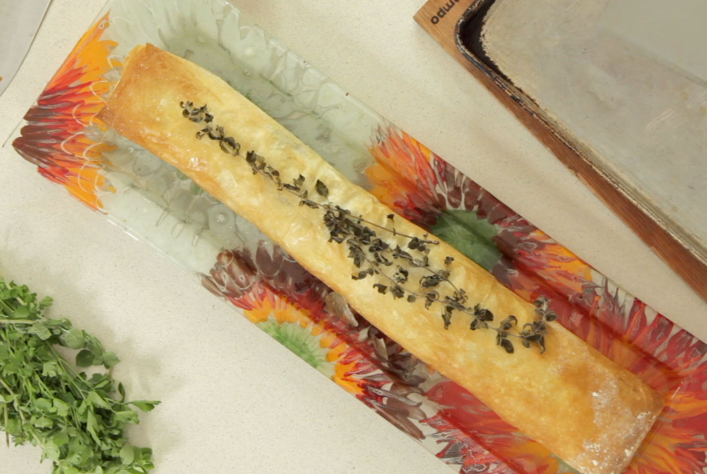Distribuir el relleno por lo largo en uno de los bordes de la masa filo, agregar hierbas frescas a gusto y cerrar formando el strudel. Disponerlo sobre una placa lubricada con Rocío Vegetal Natura Oliva, rociarlo con un hilo de Aceite de Oliva Selección Natura, decorar con unas ramitas de orégano y llevarlo a horno fuerte hasta dorar la masa. Retirar y servir.