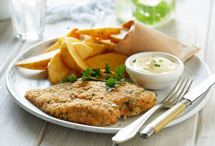 Preparar la carne cortando cada suprema a la mitad y por lo largo, darle pequeños golpes con el martillo para carnes, luego pincelarlas con Mayonesa Natura de ambos lados.