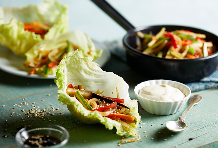 Utilizar las hojas de lechuga reservadas como si fuesen la masa de tacos, empalmar una cucharada de queso crema y disponer en el centro una cucharada generosa de relleno doblando para poder comerlo con las manos.