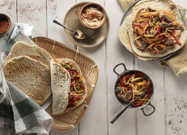Para las tortillas, disponer en un bowl la harina, sal, el Aceite Blend Natura y la Mostaza Natura, incorporar el agua e integrar todo hasta formar un bollo. Colocarlo en la mesada enharinada y amasar hasta que la masa esté pareja y suave. Dividir en 8 bollitos y dejarlos descansar tapados por un trapo de cocina por 15 minutos. Luego, estirar cada uno con palo de amasar dándoles forma hasta un espesor de 2 mm. aproximadamente. Reservarlos tapados para que no se sequen.