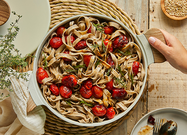 Mientras tanto, cocinar los tagliatelle en abundante agua salada, retirar al dente, escurrir bien y pasar a la sartén de los tomates confitados durante un par de minutos hasta integrar los sabores y servir.
