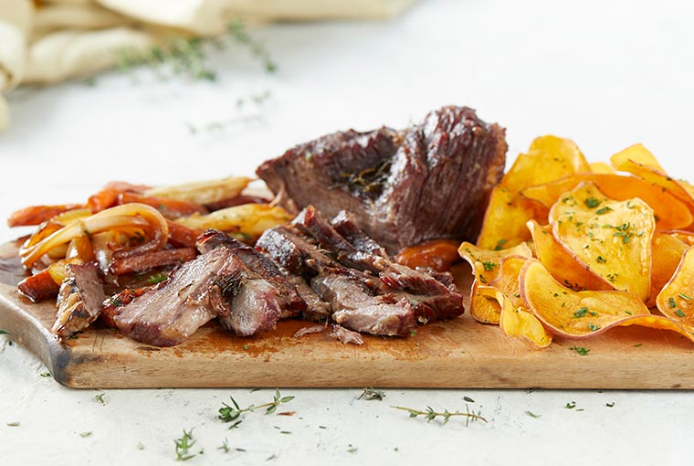 Servir la carne en rodajas acompañada con los vegetales del fondo de cocción y las batatas fritas espolvoreadas con perejil picado.