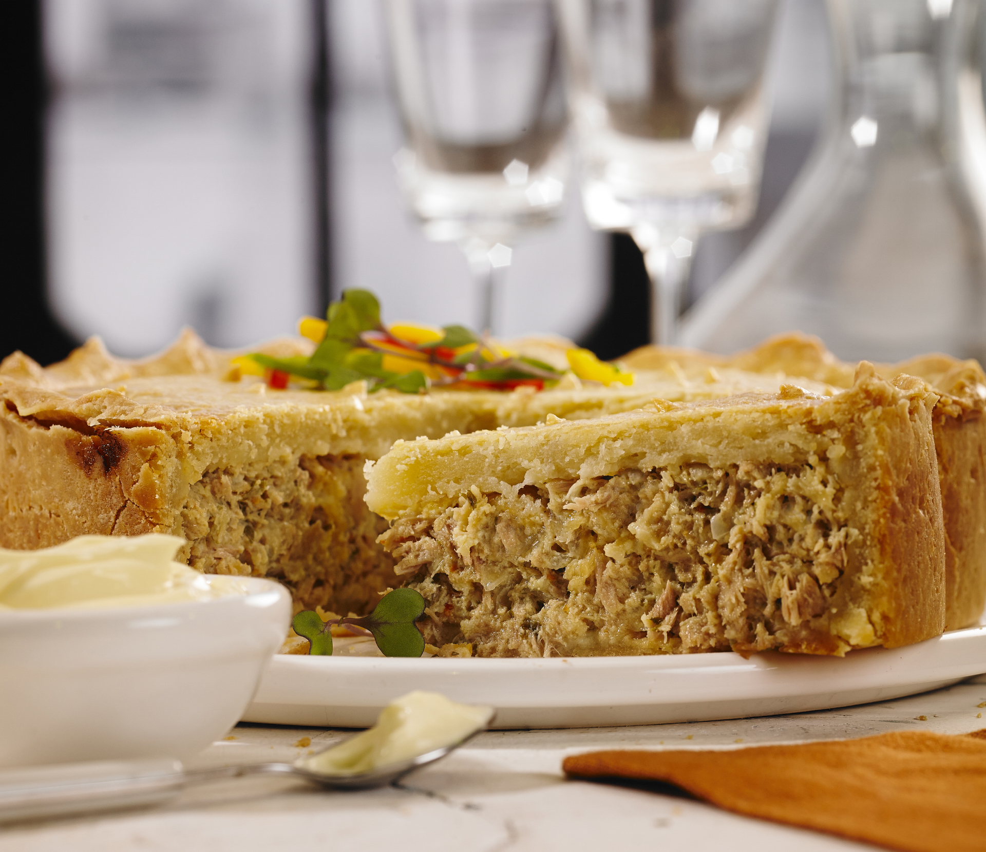 Dividir la masa en dos partes: con una de ellas forrar hasta los bordes un molde lubricado abundantemente con Rocío Vegetal Natura. Colocar el relleno en la tartera forrada con la masa y luego proceder a tapar con la otra parte de la masa.