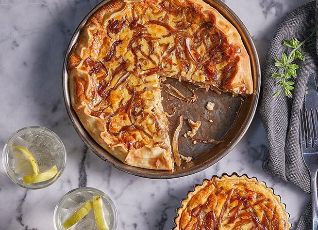 Pincelar la masa con la Mostaza Natura y distribuir la cebolla caramelizada. Añadir por encima el queso mozzarella y por último, verter la mezcla de queso y huevo.