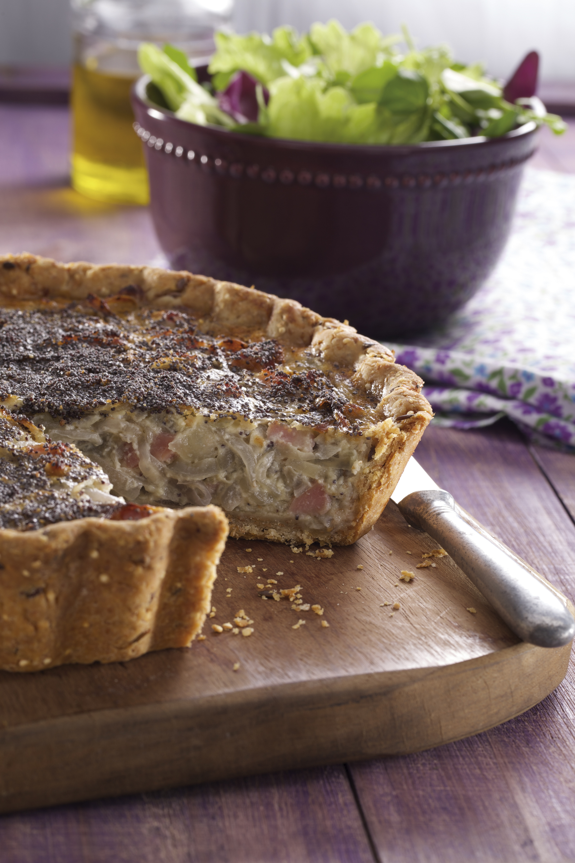 Precalentar el horno a 220º C (fuerte). Verter la mezcla de cebollas en la masa y espolvorear con las semillas de amapola. Llevar al horno de 40 a 50 minutos. Retirar, dejar entibiar y servir.