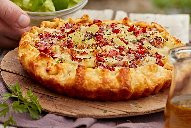 Disponer el disco de masa sobre una tartera previamente lubricada con Rocío Vegetal Oliva Natura. Distribuir el relleno de papas y atún, ajustar los bordes doblándolos ligeramente hacia la parte interna y llevar a horno medio durante 25 minutos aproximadamente hasta que la masa esté cocida.