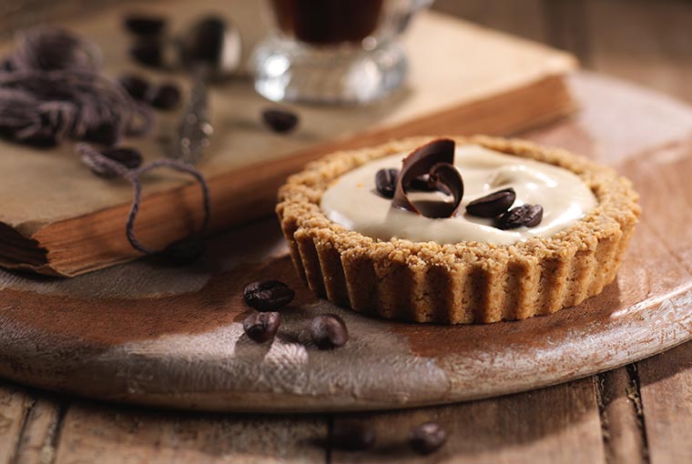 Luego, con movimientos envolventes, agregar la crema batida. Rellenar la base de torta reservada y nivelar. Refrigerar durante al menos dos horas, decorar con las láminas de chocolate y granos de café y servir.